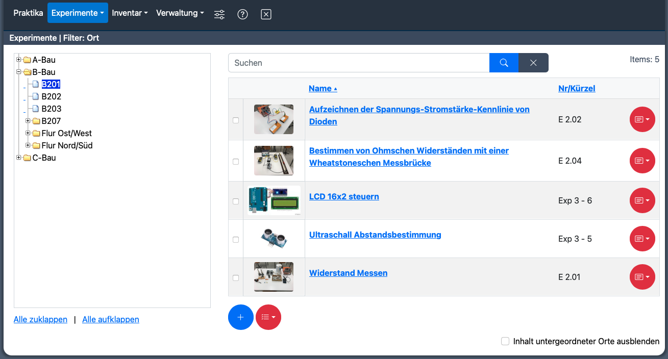 - Geräte und Experimente anhand ihres Standortes filtern: Sehen Sie auf einen Blick, welche Geräte/Experimente sich in einem Bestimmten Gebäude/Raum/Schrank/Regal befinden.