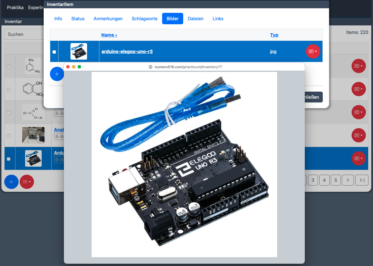 - Geräten oder Experimenten beliebig viele Bilder und Dateien (z.B. Anleitungen, Sicherheitsdatenblätter etc.) zuweisen