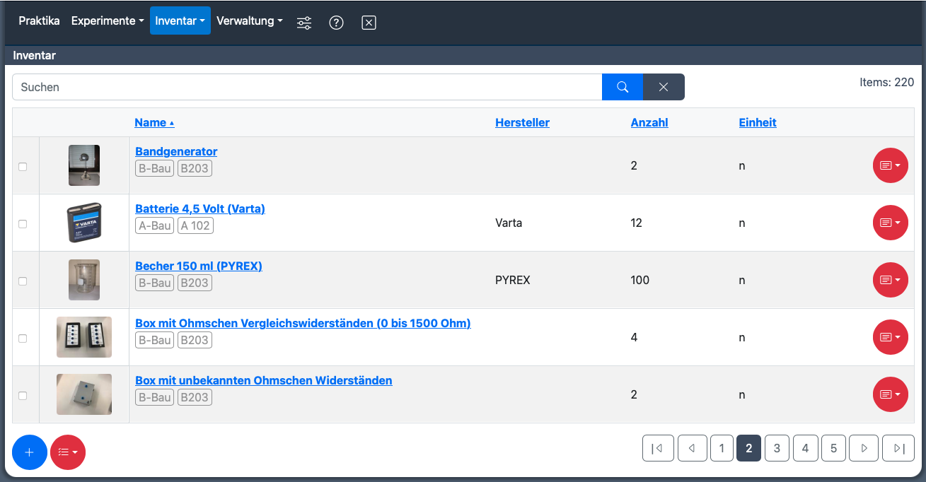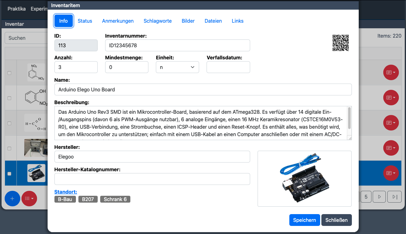 - Erzeugen von QR-Codes für Standorte: Lassen Sie sich am Tablet/Smartphone z.B. alle Geräte/Experimente die sich in einem Raumes/Schrank befinden anzeigen.